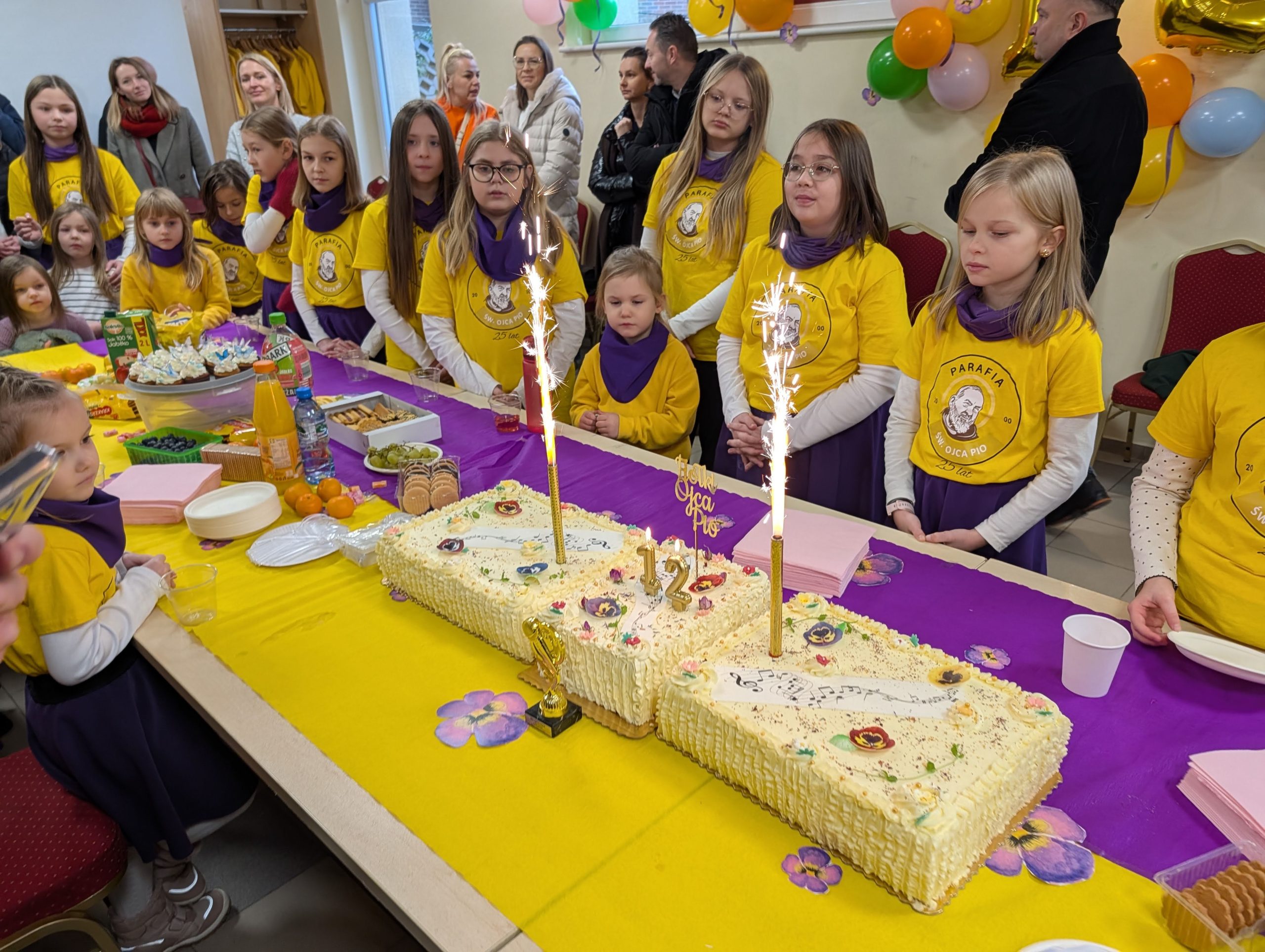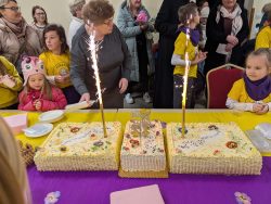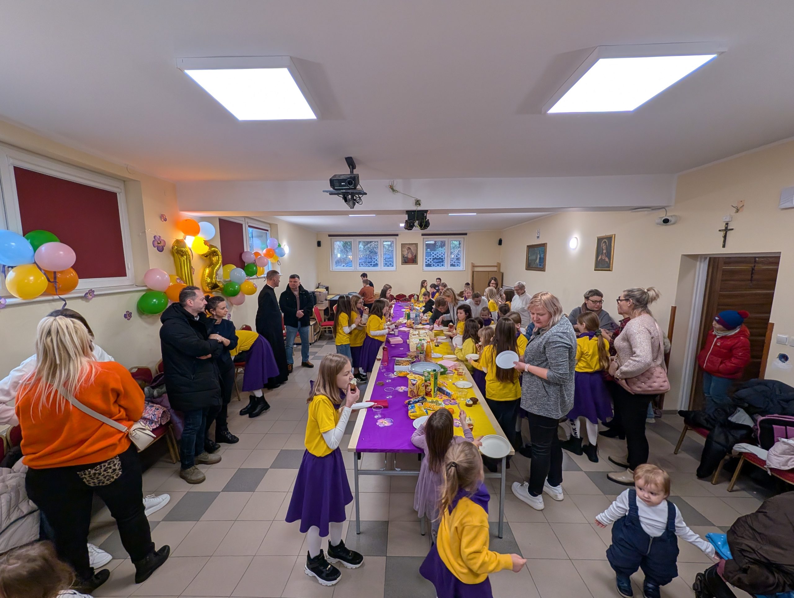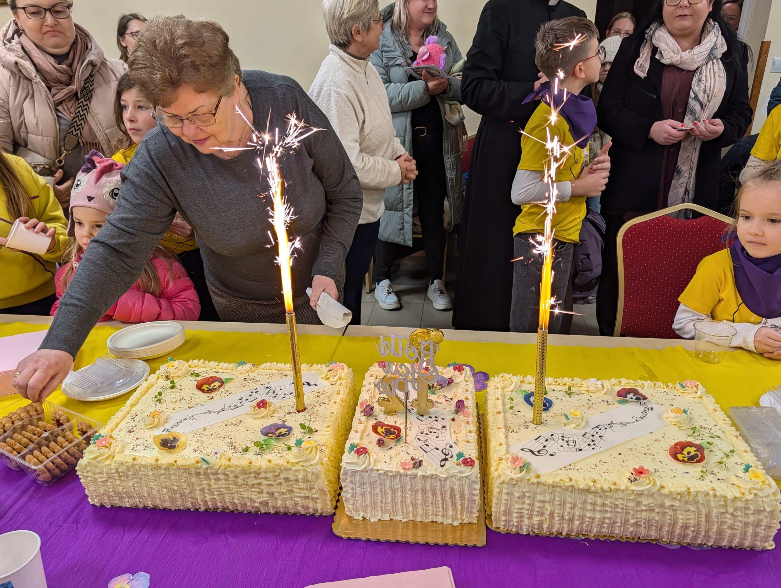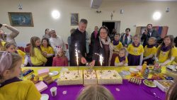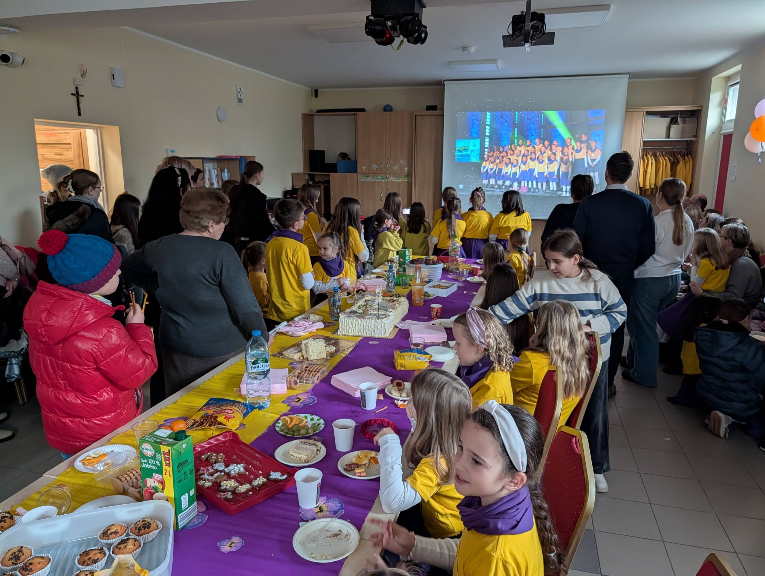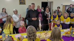 Po Mszy w domu parafialnym zgromadziliśmy się na prawdziwe świętowanie — był ogromny tort, radosne rozmowy, mnóstwo uśmiechów, a także wspomnienia uchwycone na ekranie: film o działalności Fiołków w ostatnich latach przywrócił wiele pięknych chwil i pokazał, ile dobra i zaangażowania kryje się w tej dziecięco-młodzieżowej wspólnocie.
