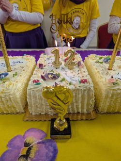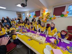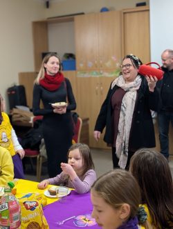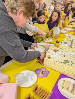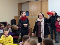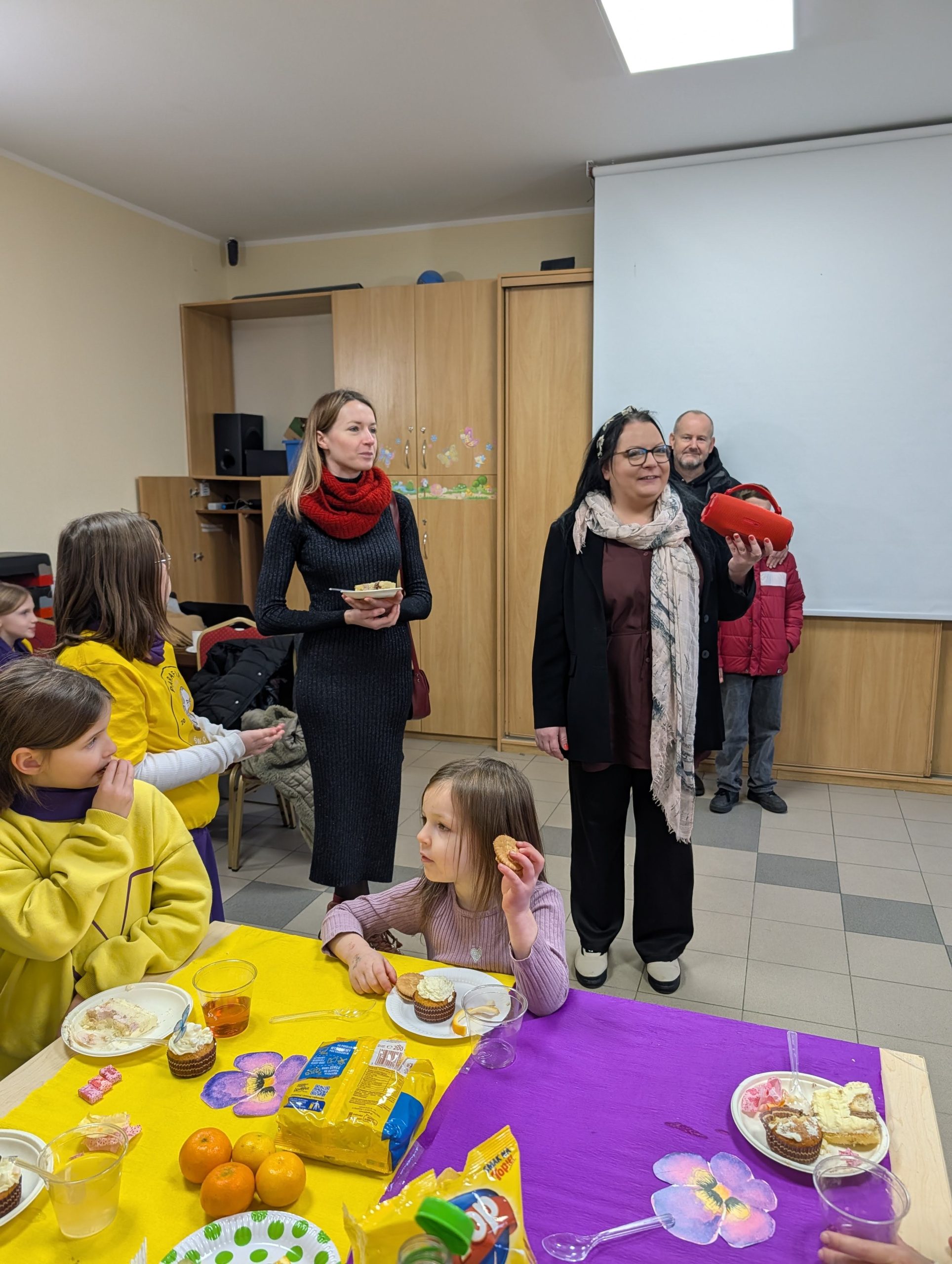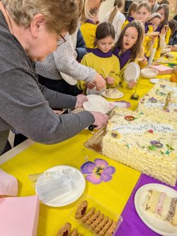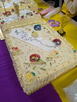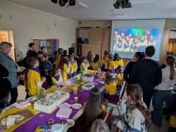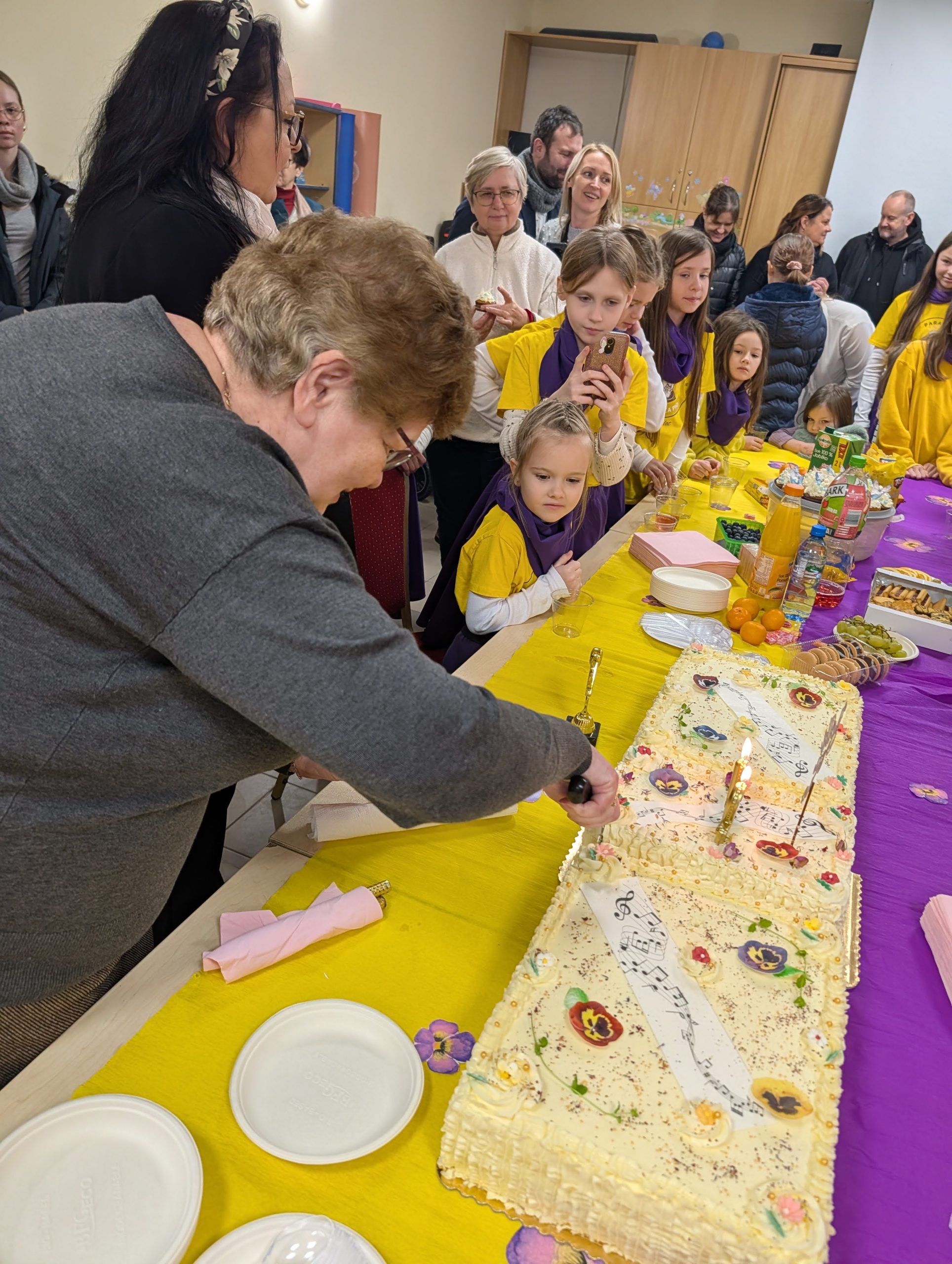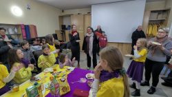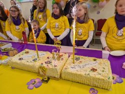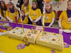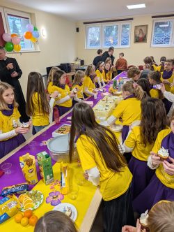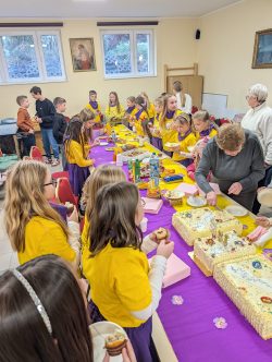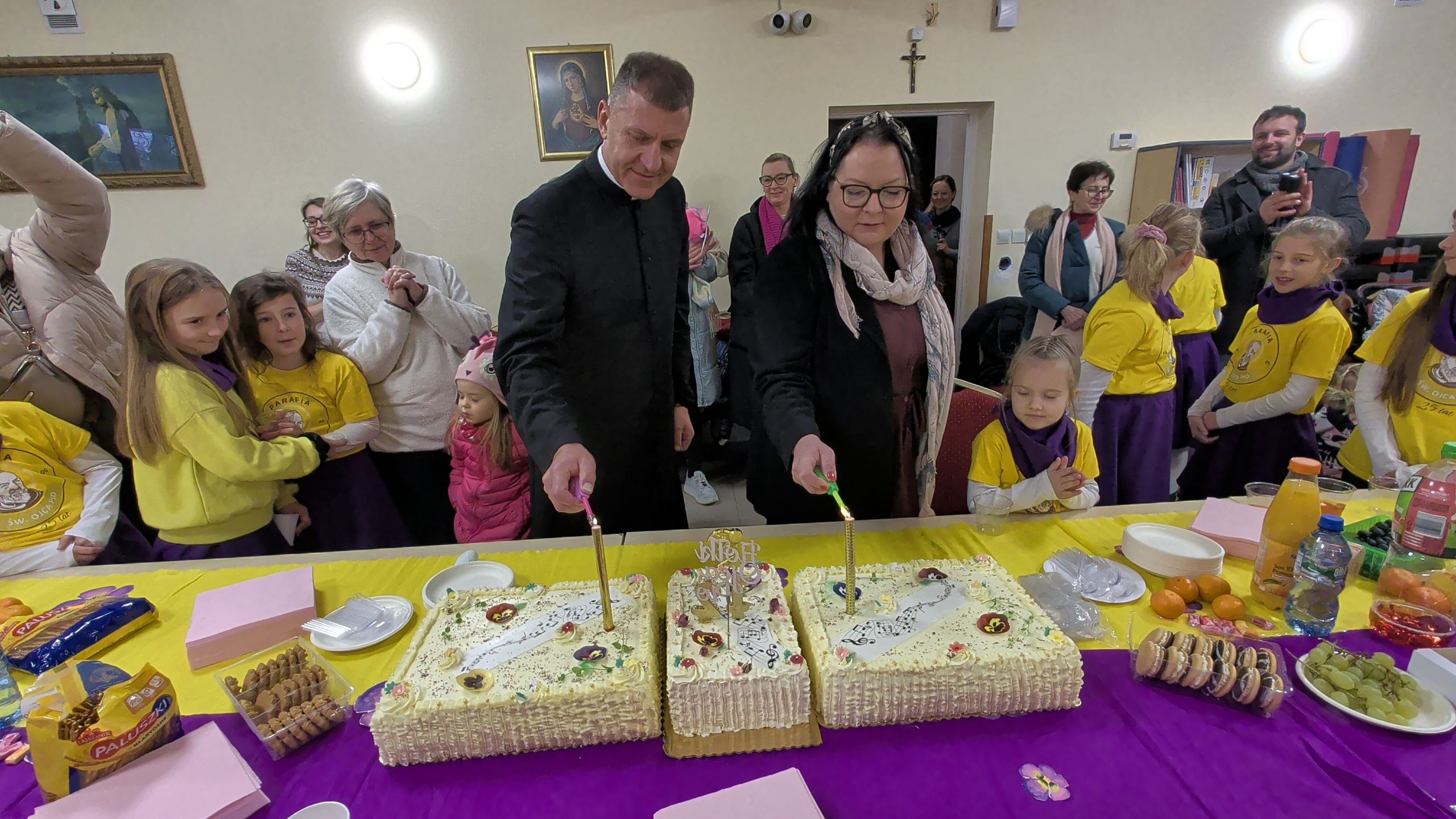 Po Mszy w domu parafialnym zgromadziliśmy się na prawdziwe świętowanie — był ogromny tort, radosne rozmowy, mnóstwo uśmiechów, a także wspomnienia uchwycone na ekranie: film o działalności Fiołków w ostatnich latach przywrócił wiele pięknych chwil i pokazał, ile dobra i zaangażowania kryje się w tej dziecięco-młodzieżowej wspólnocie.