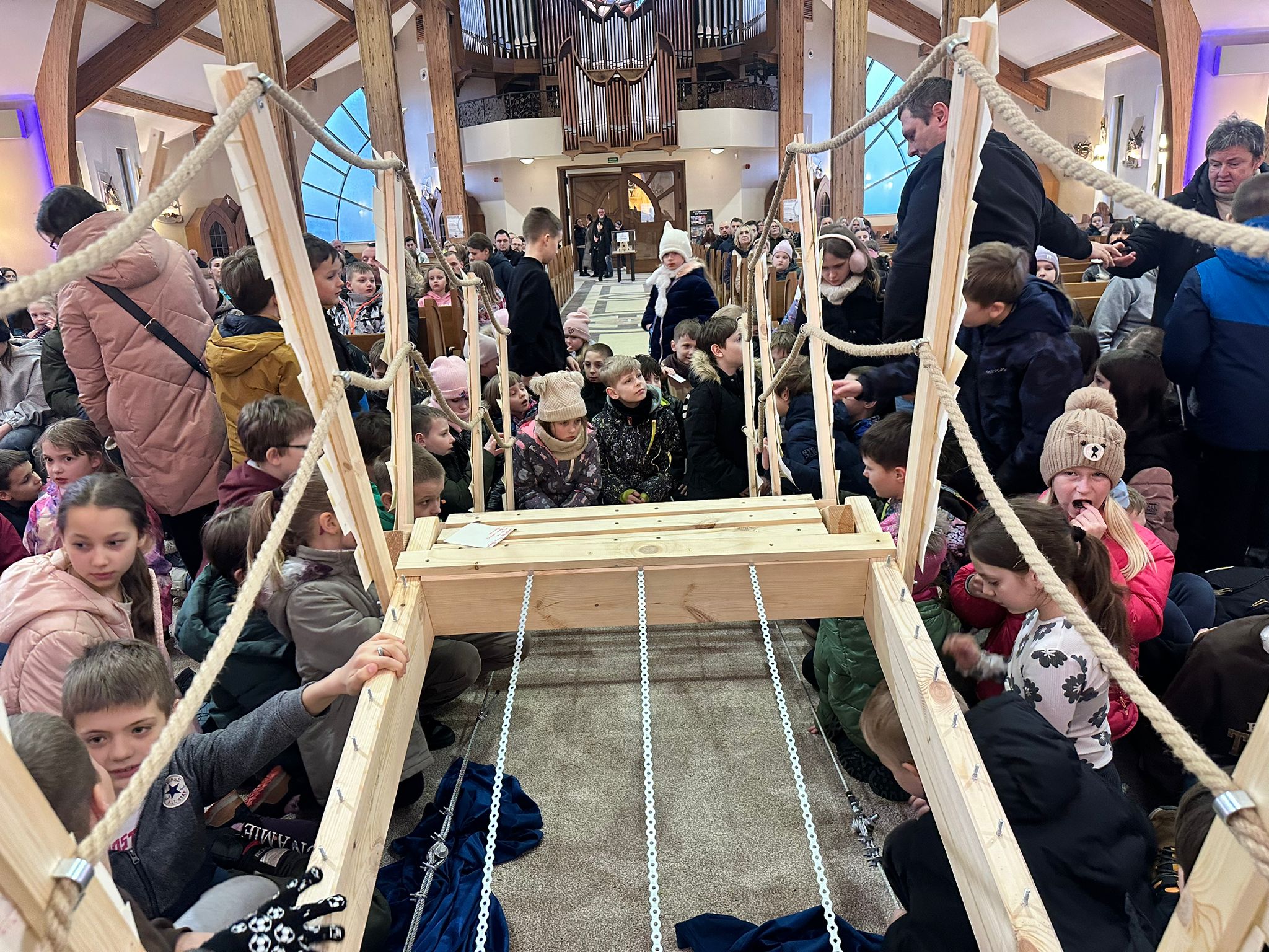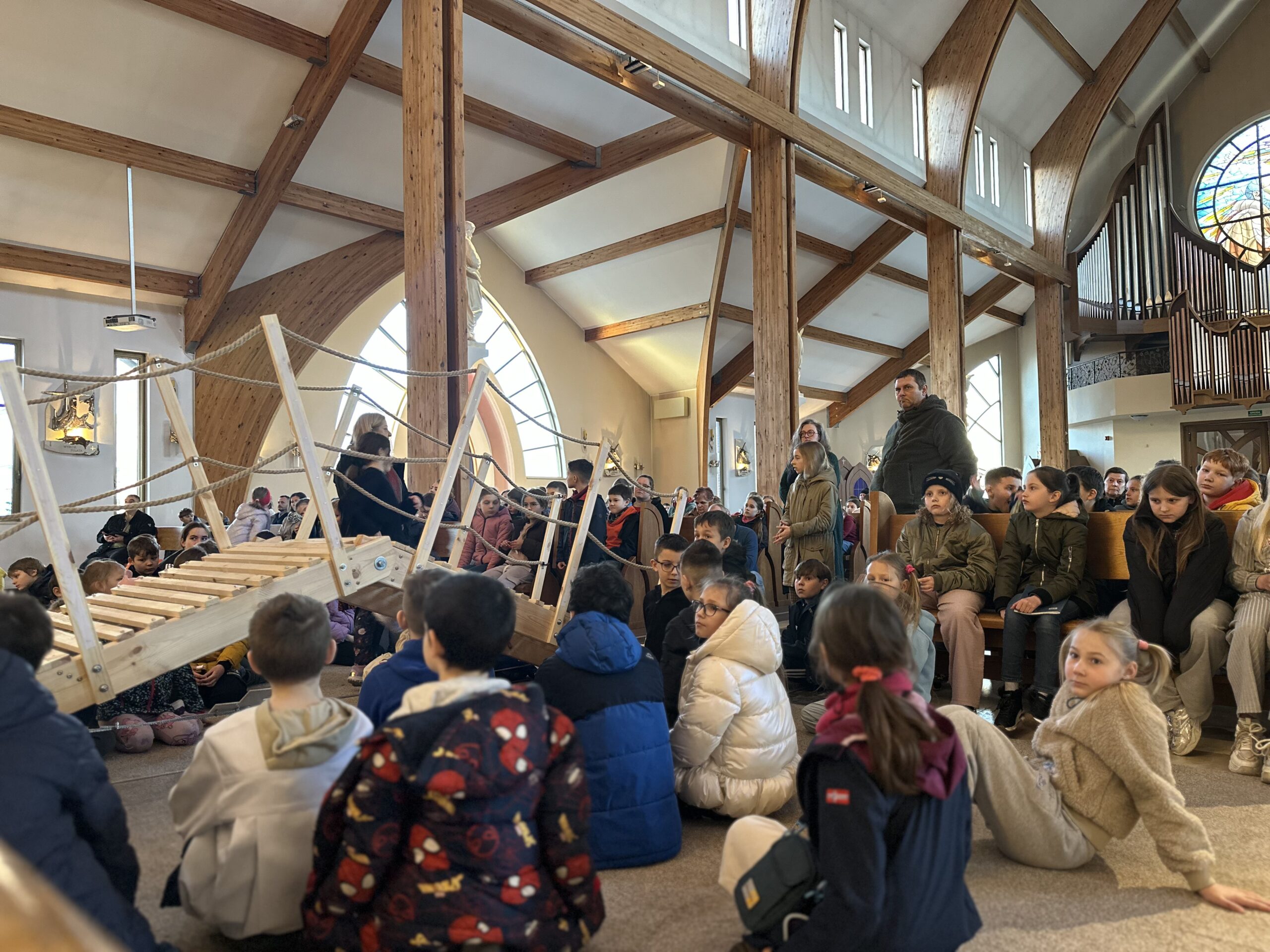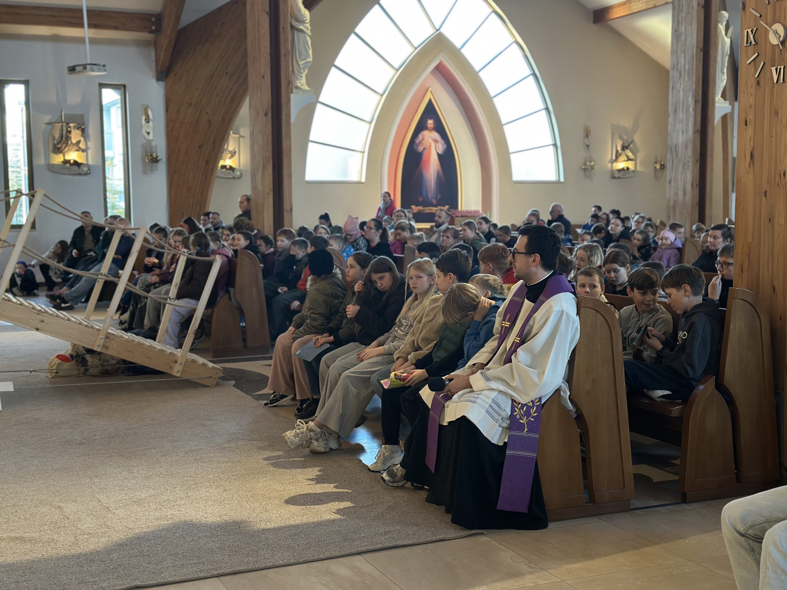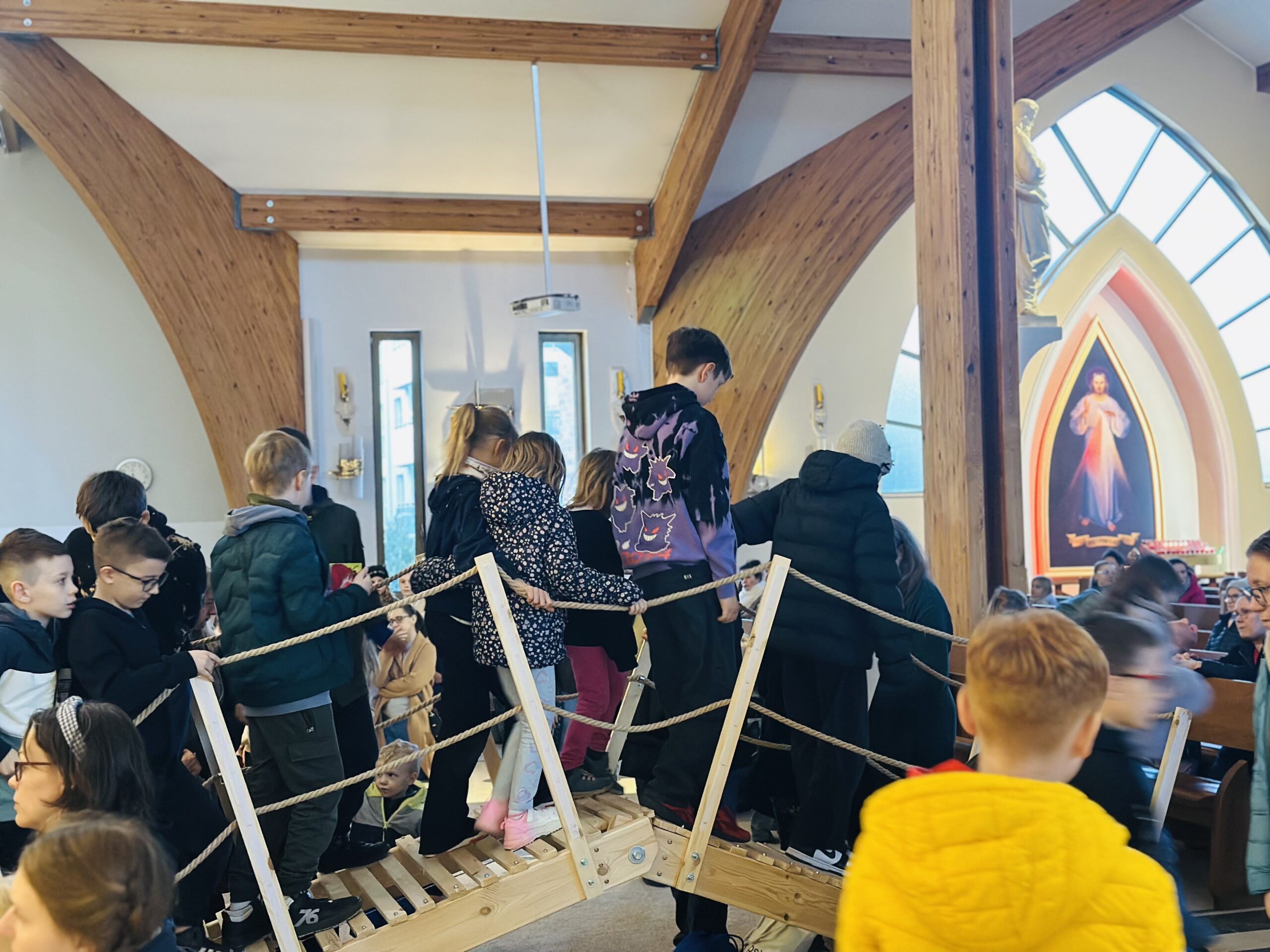 Już od pierwszego spotkania dzieci zobaczyły coś niezwykłego. Członkowie wspólnoty własnoręcznie zbudowali wielki most, który stanął w kościele. Ten most nie był tylko dekoracją. Stał się symbolem całych rekolekcji i obrazem drogi, którą każdy człowiek może przejść, aby zbliżyć się do Boga. Most łączy dwa brzegi. Pomaga przejść nad tym, co trudne, niebezpieczne albo nie do pokonania. Podobnie jest w naszym życiu duchowym. Czasem wydaje się, że między nami a Bogiem jest wielka przepaść – nasze błędy, słabości, lęki czy grzech. Rekolekcje przypominały jednak bardzo ważną prawdę: Bóg sam buduje most, który prowadzi do Niego. Tym mostem jest przede wszystkim Jezus Chrystus. To On przyszedł na świat, aby połączyć niebo z ziemią i pokazać nam drogę do Ojca.
