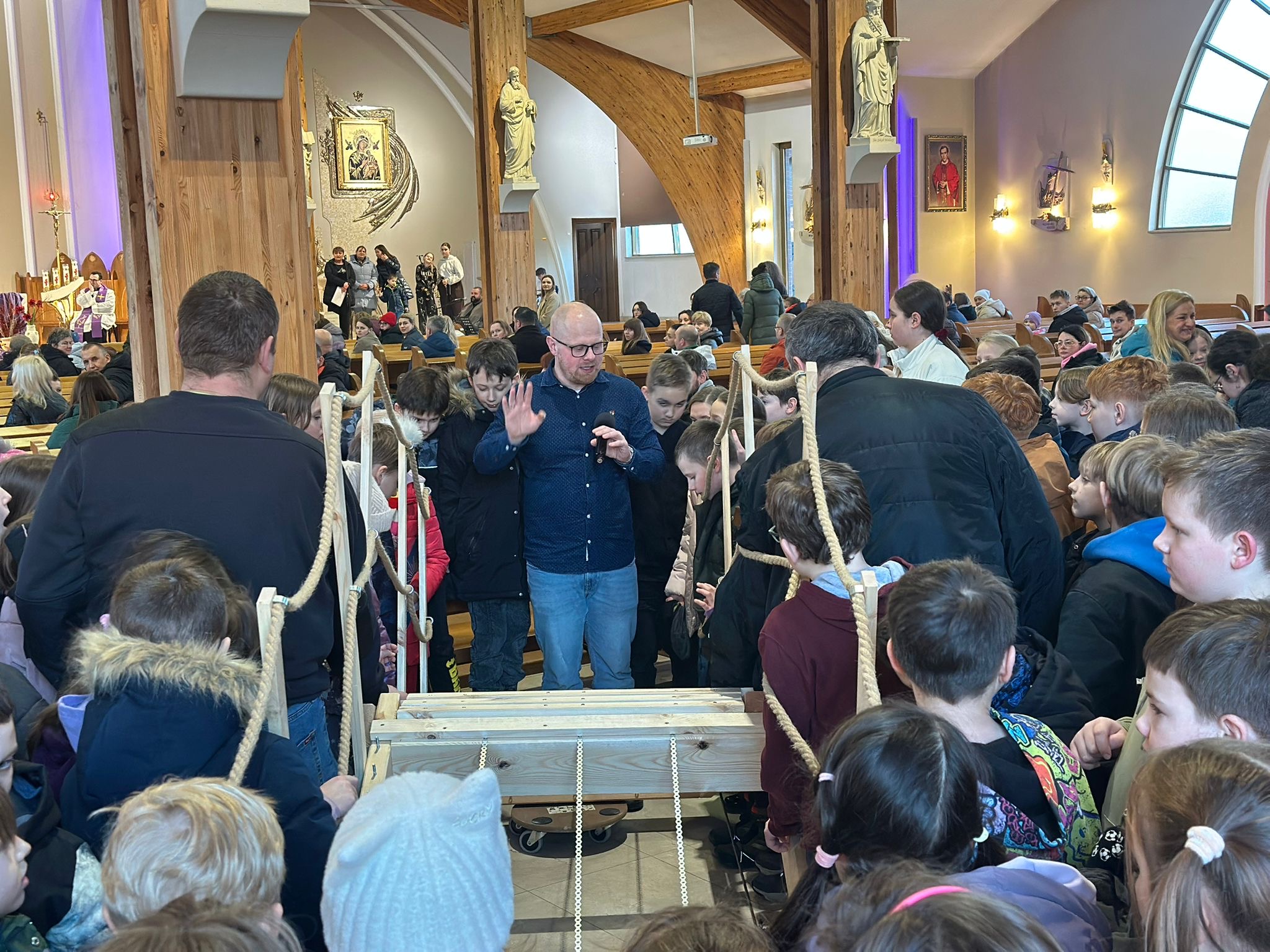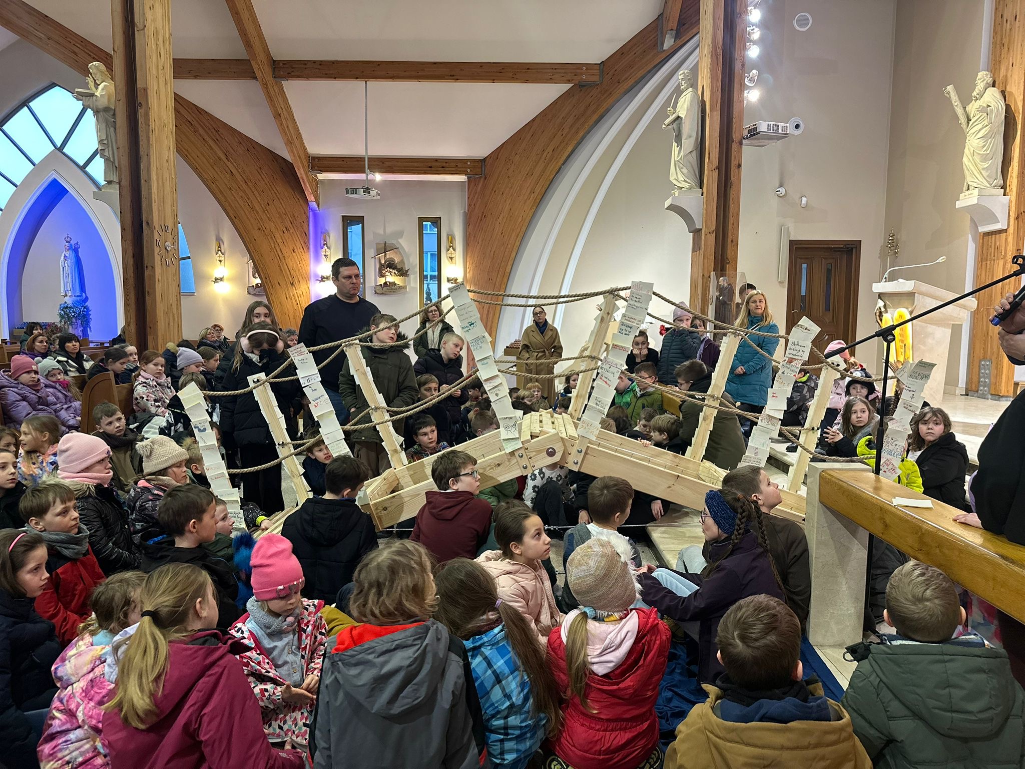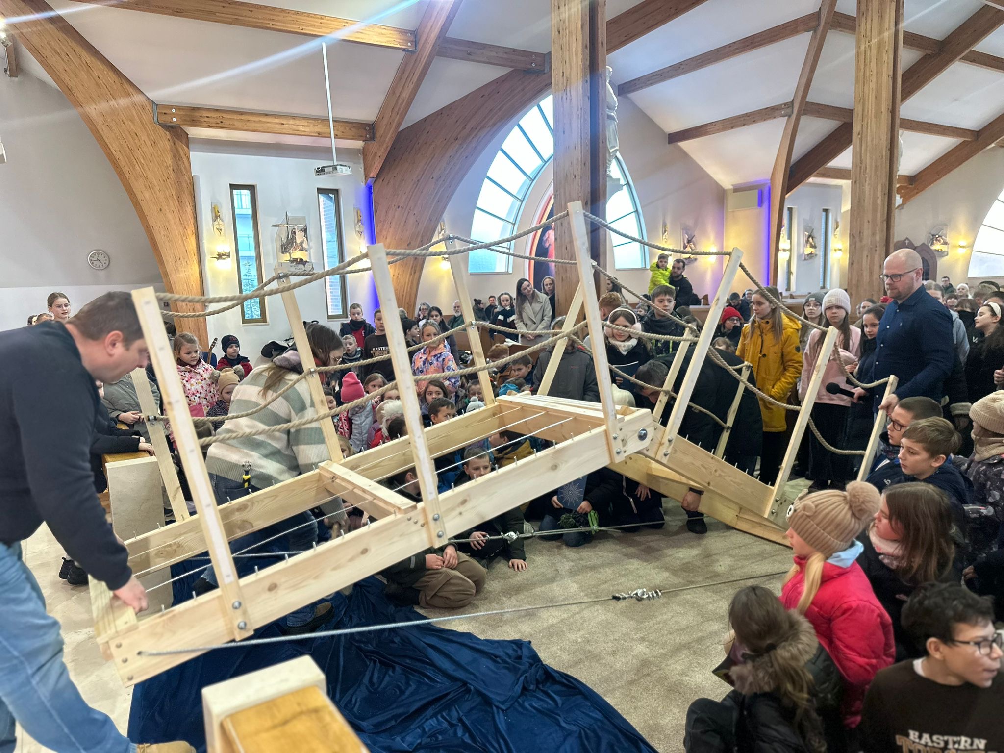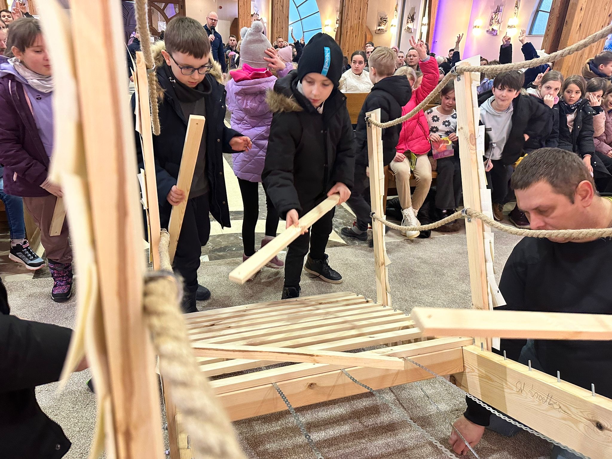 Już od pierwszego spotkania dzieci zobaczyły coś niezwykłego. Członkowie wspólnoty własnoręcznie zbudowali wielki most, który stanął w kościele. Ten most nie był tylko dekoracją. Stał się symbolem całych rekolekcji i obrazem drogi, którą każdy człowiek może przejść, aby zbliżyć się do Boga. Most łączy dwa brzegi. Pomaga przejść nad tym, co trudne, niebezpieczne albo nie do pokonania. Podobnie jest w naszym życiu duchowym. Czasem wydaje się, że między nami a Bogiem jest wielka przepaść – nasze błędy, słabości, lęki czy grzech. Rekolekcje przypominały jednak bardzo ważną prawdę: Bóg sam buduje most, który prowadzi do Niego. Tym mostem jest przede wszystkim Jezus Chrystus. To On przyszedł na świat, aby połączyć niebo z ziemią i pokazać nam drogę do Ojca.