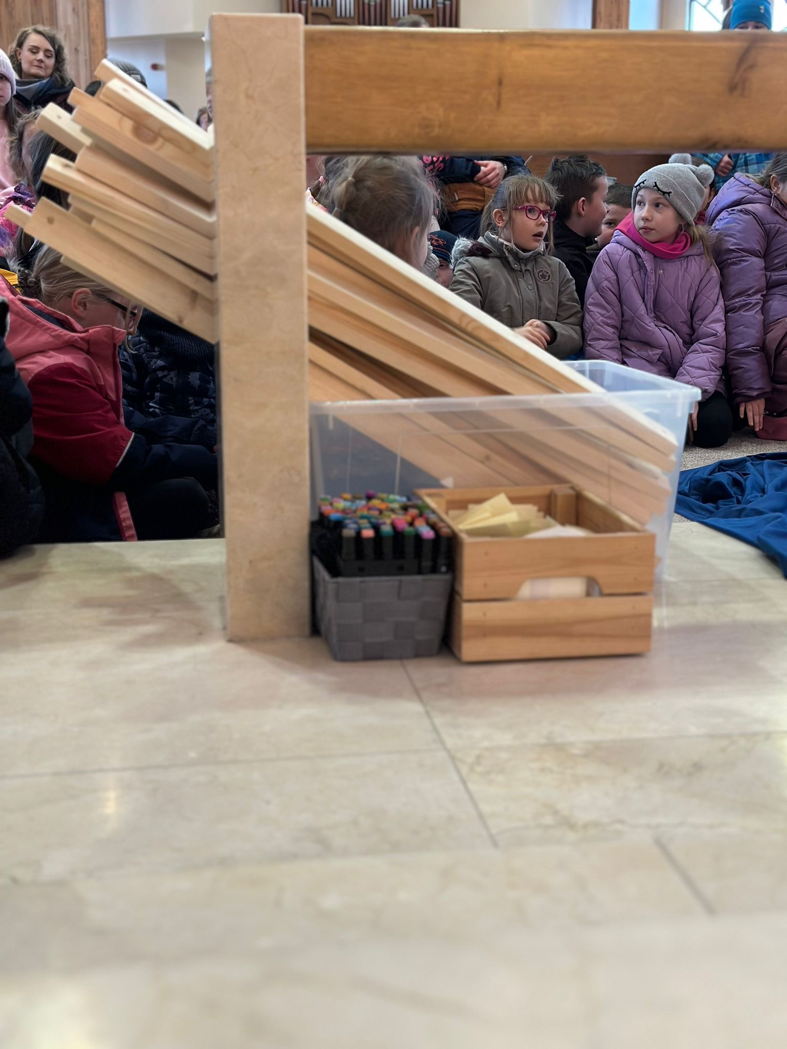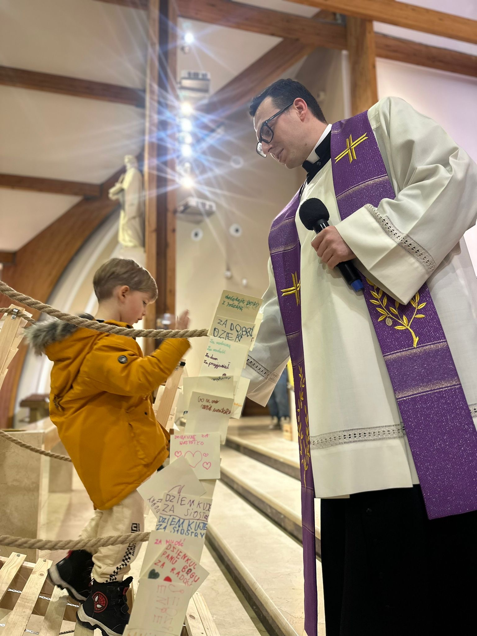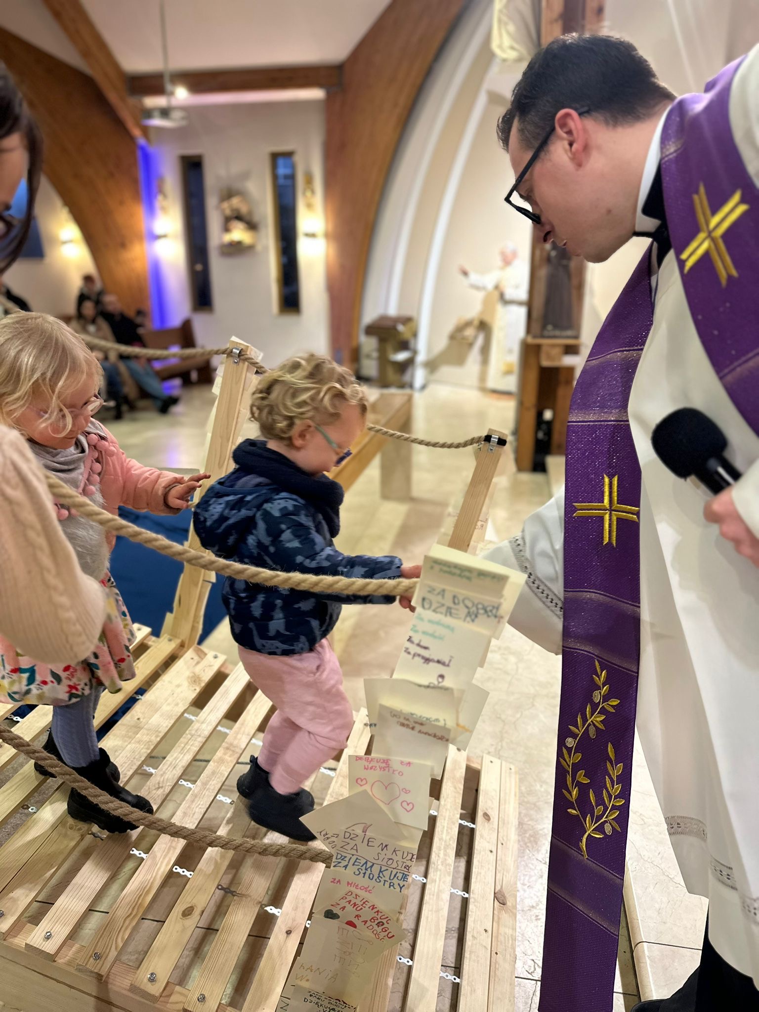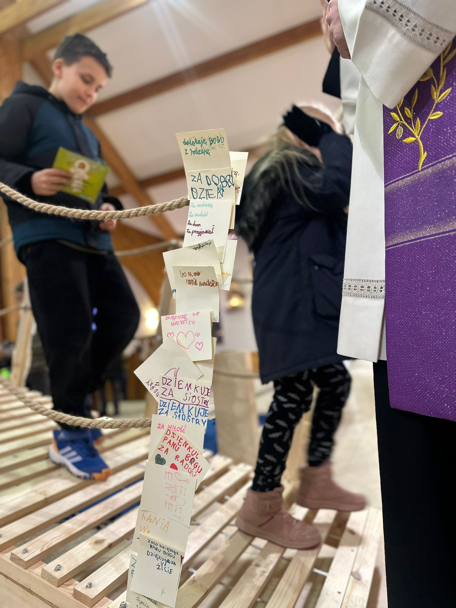 Już od pierwszego spotkania dzieci zobaczyły coś niezwykłego. Członkowie wspólnoty własnoręcznie zbudowali wielki most, który stanął w kościele. Ten most nie był tylko dekoracją. Stał się symbolem całych rekolekcji i obrazem drogi, którą każdy człowiek może przejść, aby zbliżyć się do Boga. Most łączy dwa brzegi. Pomaga przejść nad tym, co trudne, niebezpieczne albo nie do pokonania. Podobnie jest w naszym życiu duchowym. Czasem wydaje się, że między nami a Bogiem jest wielka przepaść – nasze błędy, słabości, lęki czy grzech. Rekolekcje przypominały jednak bardzo ważną prawdę: Bóg sam buduje most, który prowadzi do Niego. Tym mostem jest przede wszystkim Jezus Chrystus. To On przyszedł na świat, aby połączyć niebo z ziemią i pokazać nam drogę do Ojca.