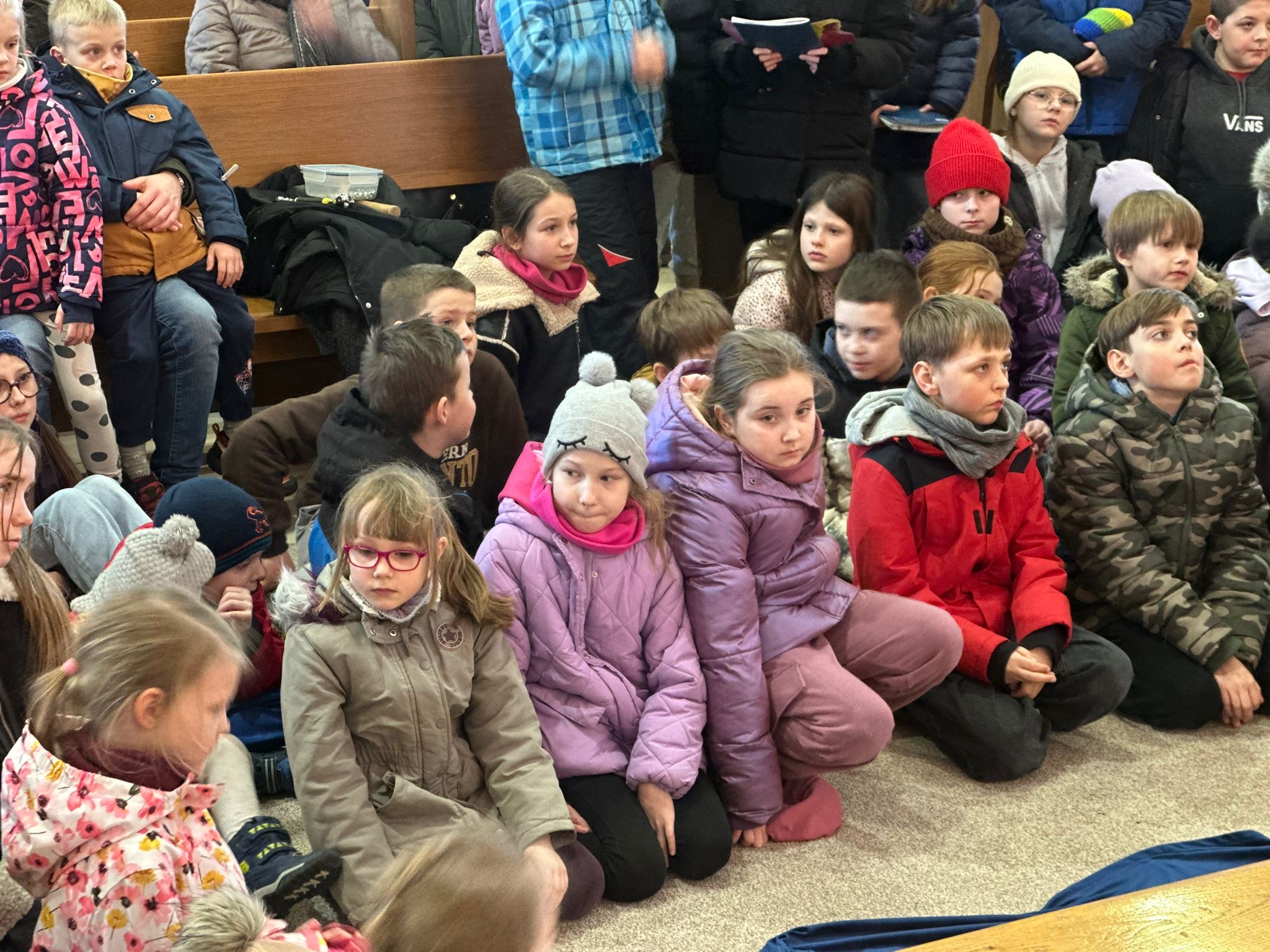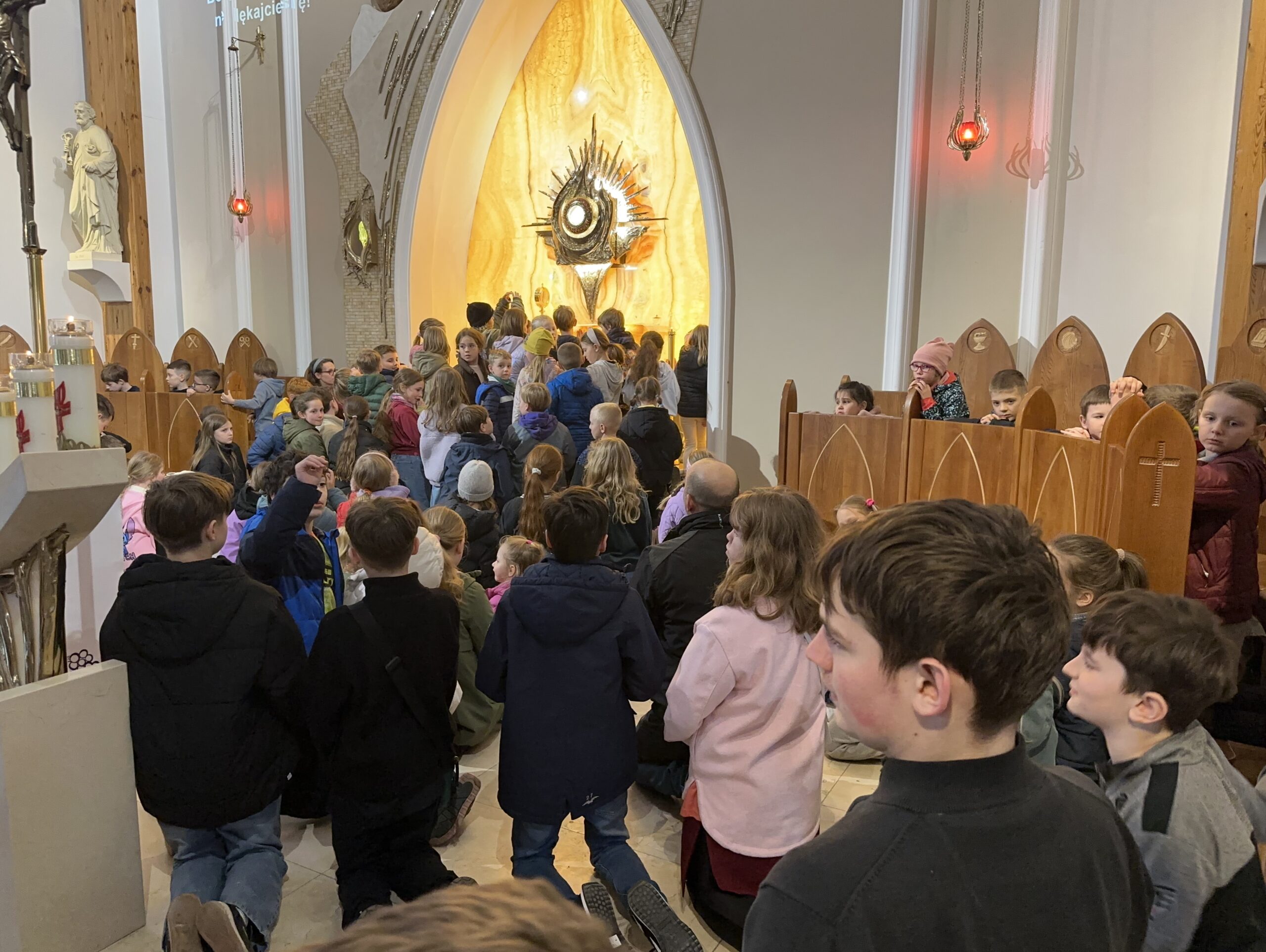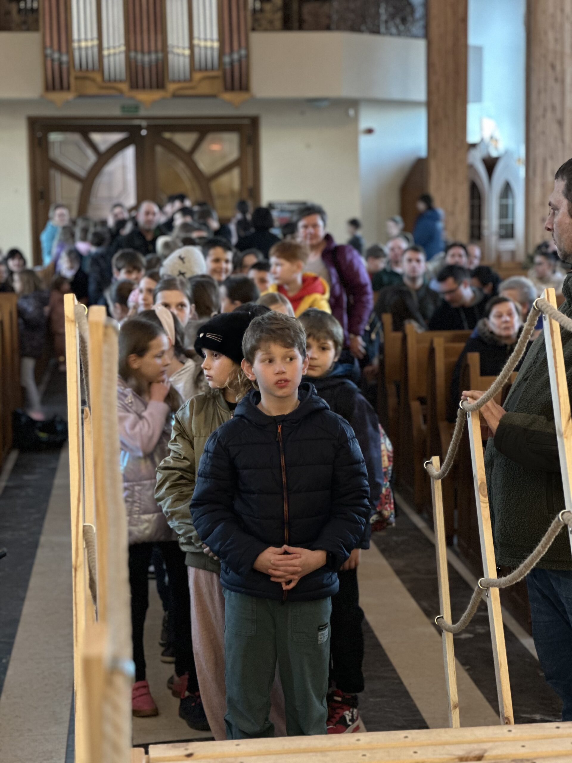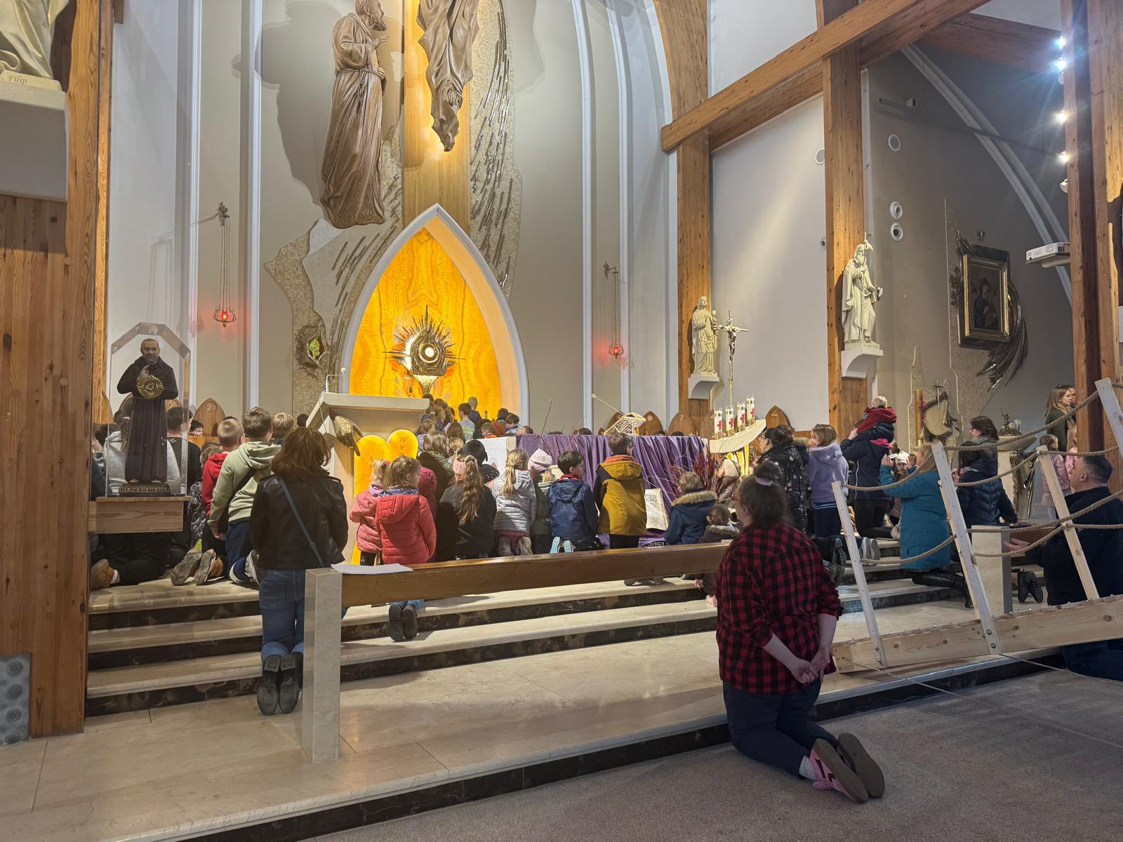 Ważnym momentem rekolekcji była także adoracja Najświętszego Sakramentu. Po dynamicznych scenkach i wspólnej modlitwie przychodził czas ciszy i spotkania z Jezusem. Dzieci mogły podejść bardzo blisko Pana Jezusa obecnego w Najświętszym Sakramencie. Dla wielu z nich było to szczególne doświadczenie – chwila zatrzymania, modlitwy i osobistego spotkania z Bogiem. To właśnie wtedy most, o którym tyle mówiono podczas rekolekcji, stawał się czymś bardzo konkretnym. Dzieci mogły zobaczyć, że Bóg nie jest kimś dalekim, ale jest blisko – tak blisko, że można stanąć tuż przy Nim i z Nim porozmawiać.