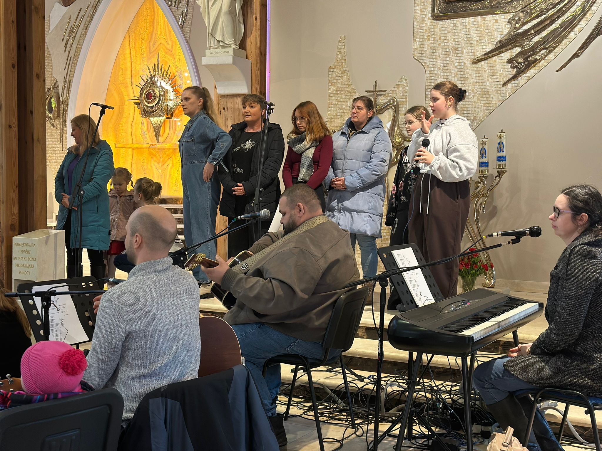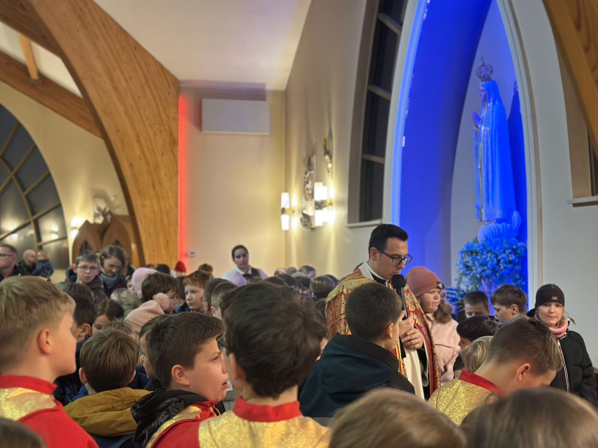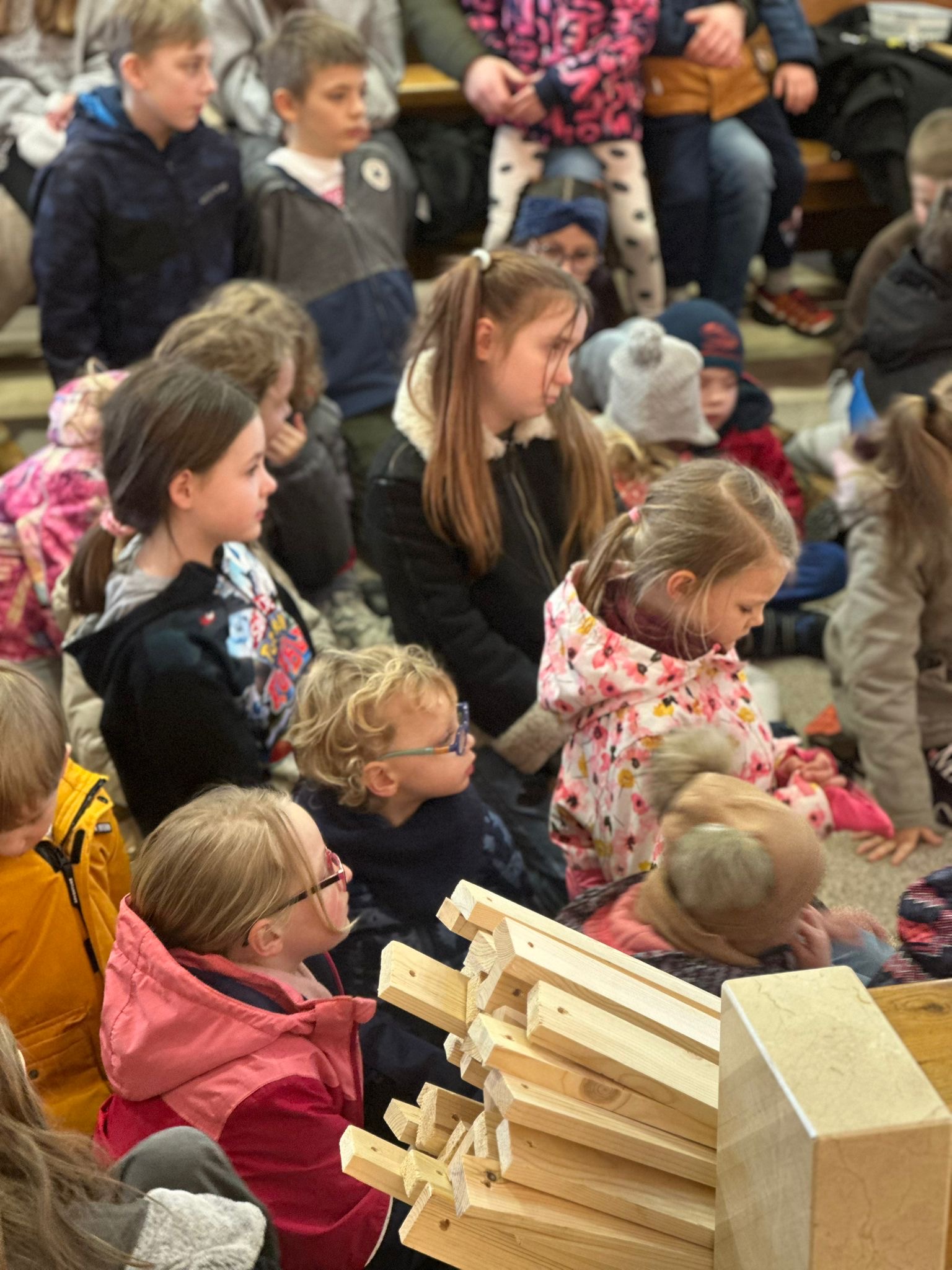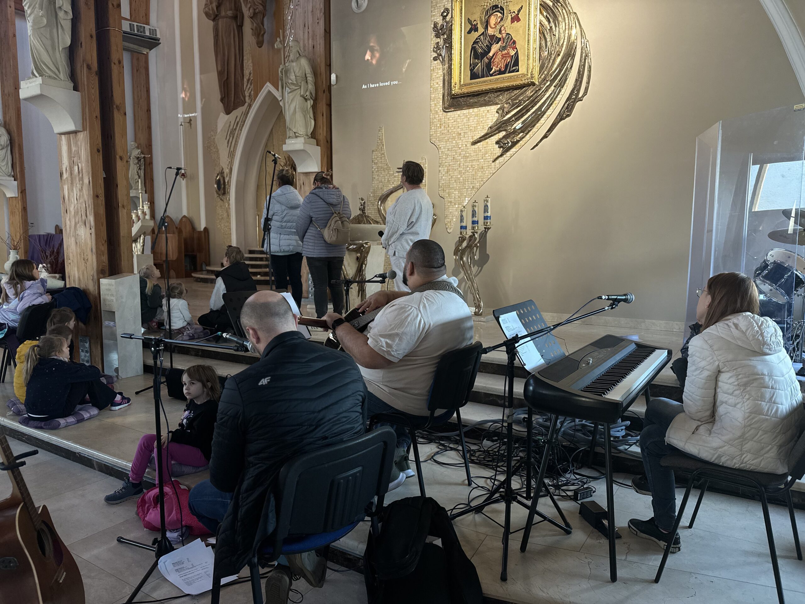 Ważnym momentem rekolekcji była także adoracja Najświętszego Sakramentu. Po dynamicznych scenkach i wspólnej modlitwie przychodził czas ciszy i spotkania z Jezusem. Dzieci mogły podejść bardzo blisko Pana Jezusa obecnego w Najświętszym Sakramencie. Dla wielu z nich było to szczególne doświadczenie – chwila zatrzymania, modlitwy i osobistego spotkania z Bogiem. To właśnie wtedy most, o którym tyle mówiono podczas rekolekcji, stawał się czymś bardzo konkretnym. Dzieci mogły zobaczyć, że Bóg nie jest kimś dalekim, ale jest blisko – tak blisko, że można stanąć tuż przy Nim i z Nim porozmawiać.