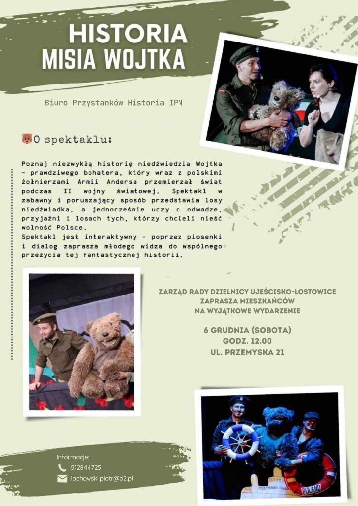 Rada Dzielnicy Gdańsk Ujeścisko przy współpracy z naszą parafią zaprasza na spektakl zatytułowany: Historia Misia Wojtka. To oparta na fatach opowieść o historii niewdźwiadka, który wraz z polskimi żołnierzami Armii gen. Andersa przemierzał świat podczas II wojny światowej. Inscenizacja 6 grudnia o godz. 12.00 w domu parafialnym.
