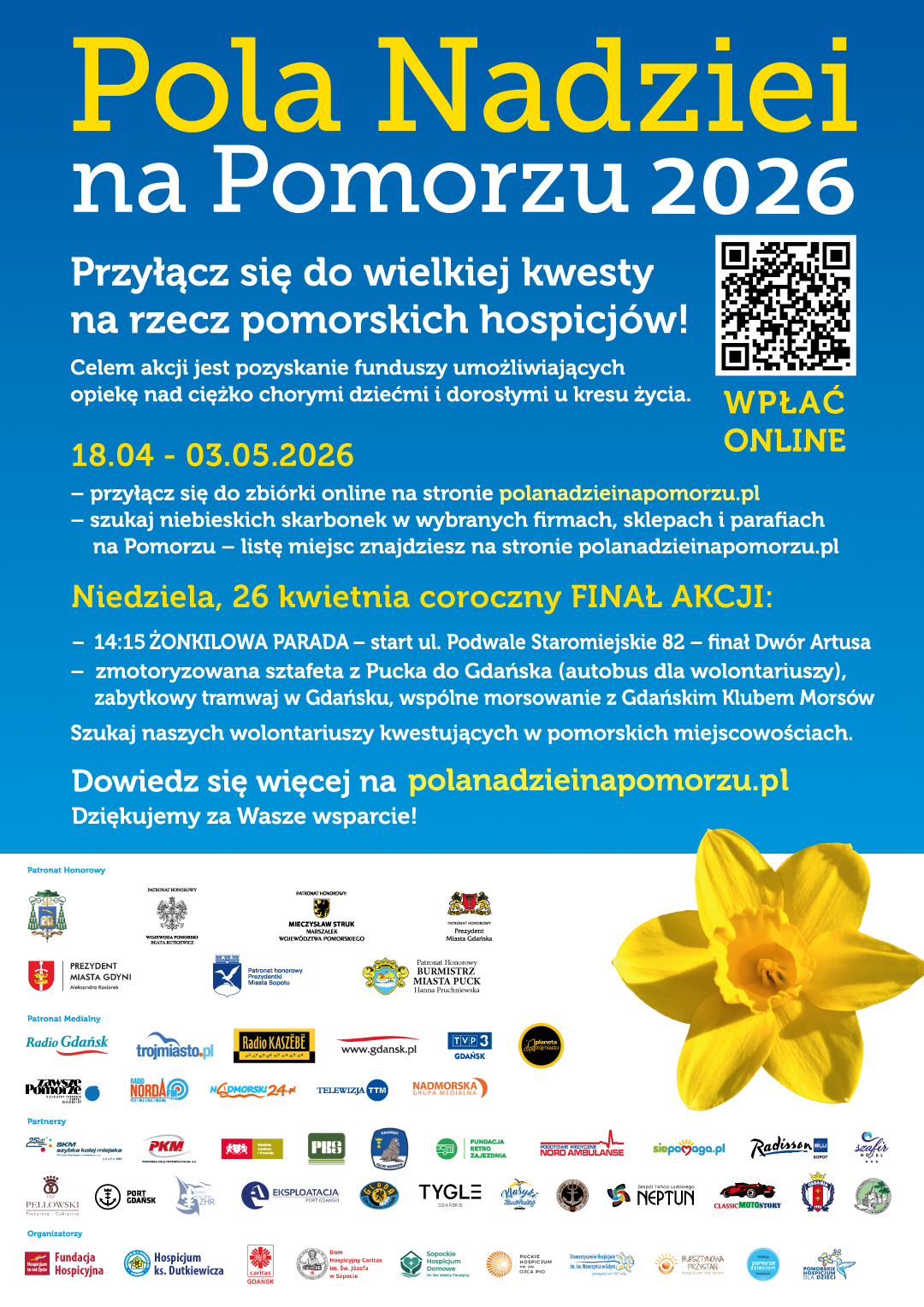 Przeprowadzona będzie także zbiórka online w dniach 18.04 – 03.05.2026 r. Pola Nadziei na Pomorzu zorganizują wspólnie: Fundacja Hospicyjna, prowadząca Hospicjum dla Dzieci i Dorosłych im. ks. E. Dutkiewicza SAC w Gdańsku, Fundacja Hospicjum Pomorze Dzieciom, Fundacja Pomorskie Hospicjum dla Dzieci, Dom Hospicyjny Caritas im. św. Józefa w Sopocie, Stowarzyszenie Hospicjum im. św. siostry Faustyny w Sopocie, Stowarzyszenie Hospicjum im. św. Wawrzyńca w Gdyni wraz z Domem Hospicyjnym dla Dzieci „Bursztynowa Przystań”, Stowarzyszenie Puckie Hospicjum pw. św. Ojca Pio. Dochód z całej zbiórki wesprze działalność ww. hospicjów.